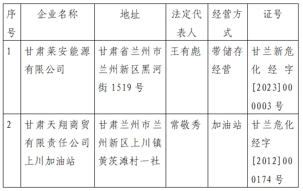 依据《危险化学品经营许可证管理办法》(国家安全监管总局令第55号,2015年5月27日国家安全监管总局令第79号修正)第十八条、第二十七条规定,因企业终止危险化学品经营活动,决定对甘肃天翔商贸有限责任公司上川加油站《危险化学品经营许可证》依法予以注销。
