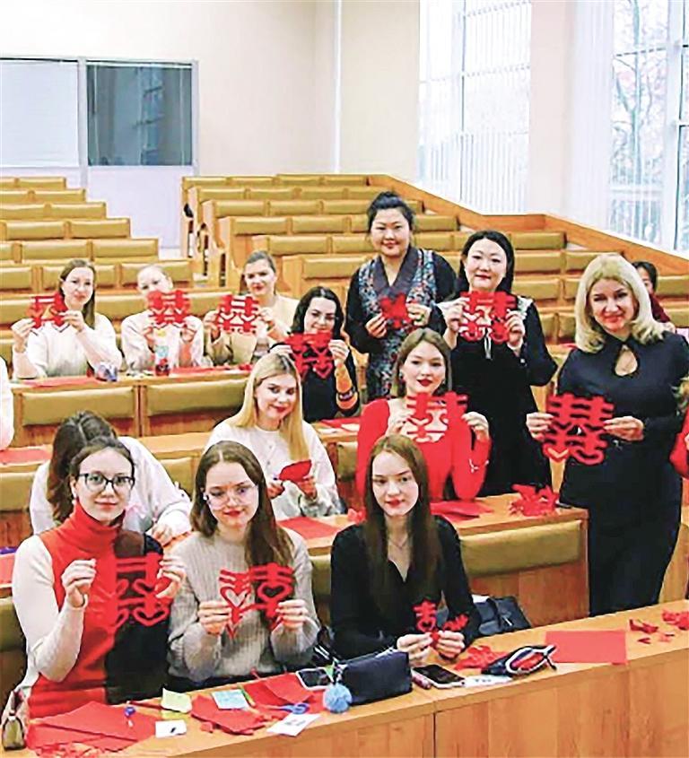 近日,甘肃财贸职业学院组织的“中国甘肃剪纸艺术”文化交流活动在白俄罗斯国立经济大学成功举办。图为同学们展示剪纸作品。甘肃财贸职业学院供图