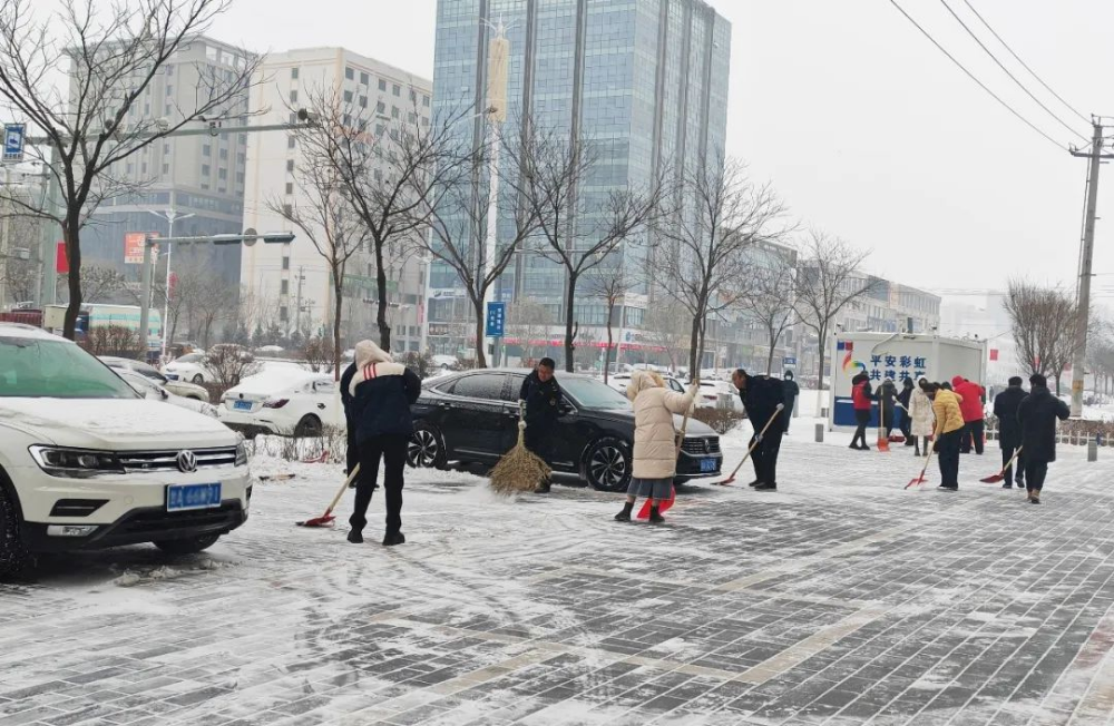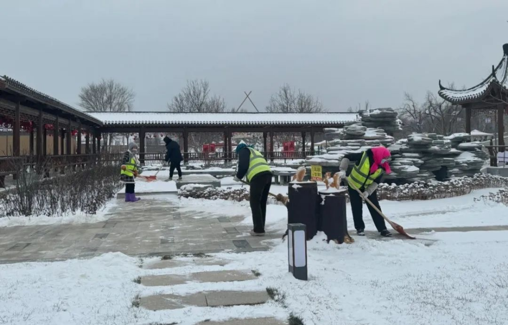 兰州新区新中实业发展有限责任公司各项目物业人员以雪为令立即对各项目重点道路、主干道、人行道、广场等区域的积雪进行清理。公司还派出专业人员巡检设施设备,从水电管网至游乐器械,逐处细查,防寒保暖、加固调试,不容丝毫差错,力保低温下运转如常,暖居基石稳固。