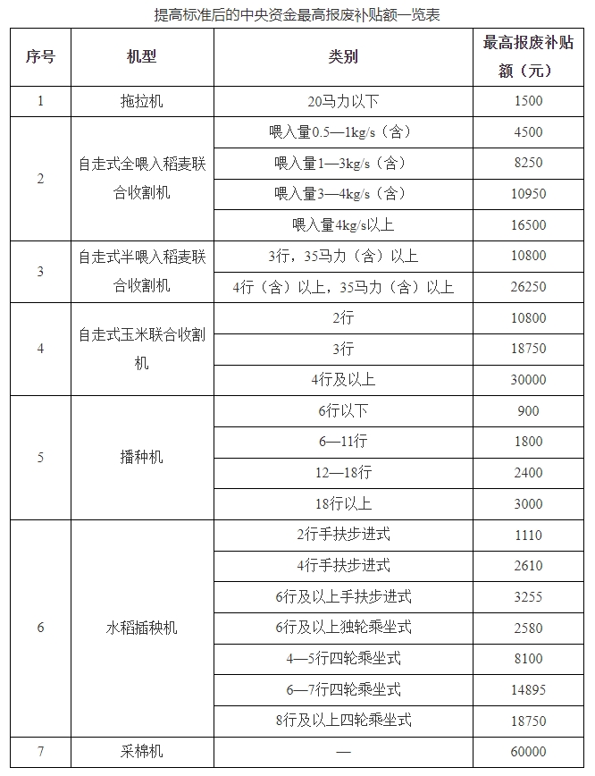 报废20马力以下拖拉机,单台最高报废补贴额由1000元提高到1500元;报废联合收割机、水稻插秧机、播种机并新购置同种类机具,按不超过50%提高报废补贴标准,单台最高报废补贴额不超过3万元;报废并更新购置采棉机,单台最高报废补贴额由3万元提高到6万元(详见附件)。除20马力以下拖拉机外,对只申请报废不新购置的,继续执行《通知》规定的报废补贴标准。对自《通知》印发之日起提交报废补贴申请的,按调整后的报废补贴标准执行,对已领取报废补贴的,补齐差额部分补贴。