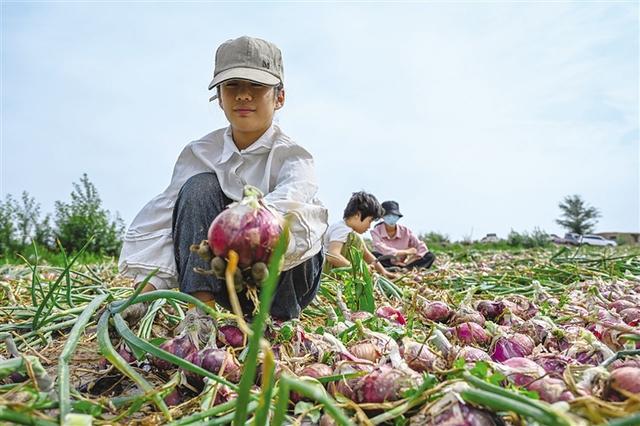 在新区中川园区洋葱种植基地,空气中弥漫着洋葱清香,村民们忙着清理洋葱的泥土、修剪根叶、分拣装袋。洋葱收获期,大量的用工需求吸引了周围村民的积极参与,种植基地在解决采收难题的同时,也让村民增加了经济收入。“今年,我们种植了4500多亩洋葱,得益于田间管理技术的大幅提升,洋葱长势喜人。”甘肃美佳乐农业有限公司总经理薛正贤说,新区昼夜温差大、光照充足,种出的洋葱个头大、质量好、耐储存,深受各地客商青睐。在洋葱种植、采收等用工高峰期,基地每日可吸纳100多名周边村民务工,人均日收入200元至300元不等,洋葱已成为群众增收致富的“金疙瘩”。