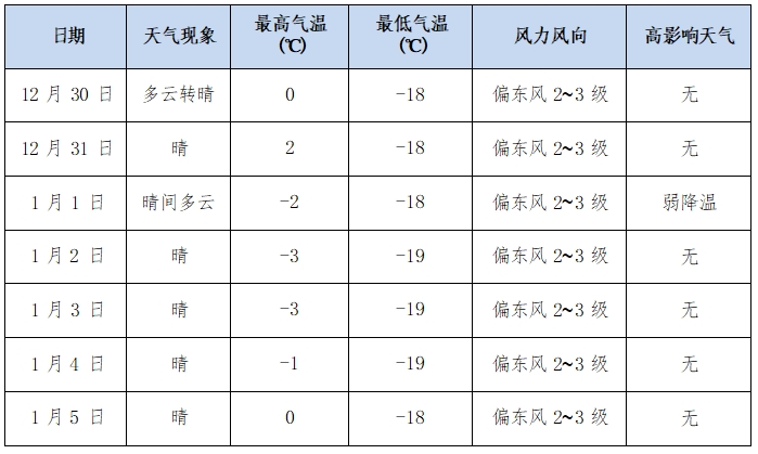 1月1日至2日,受弱冷空气影响,气温有所下降;1月3日至5日,主要受西北气流影响,新区天气以晴为主,气温缓慢回升,但整体气温仍然较低。