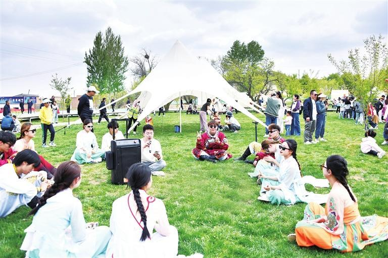 年轻人围坐在史喇口乡村旅游区的草地上歌唱