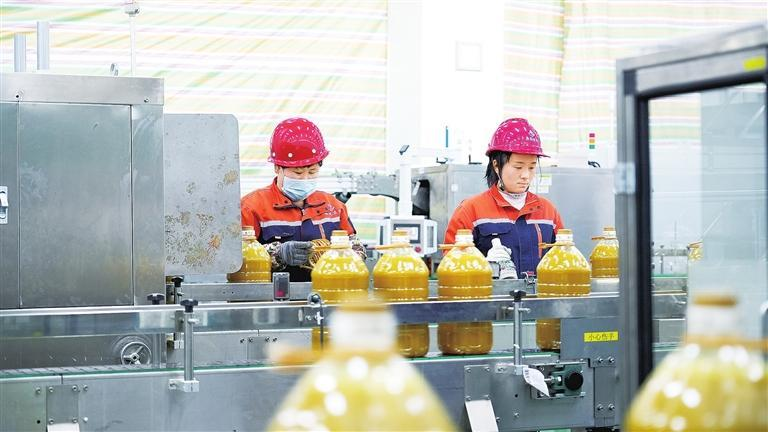 工人正在检查粮油灌装情况