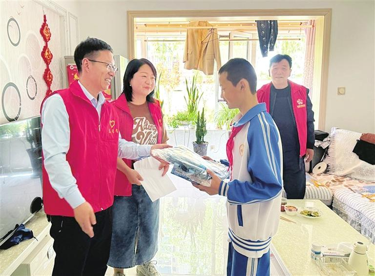 工作人员为留守儿童送上精美文具