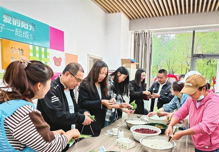 社区工作者和居民一起包粽子、话家常